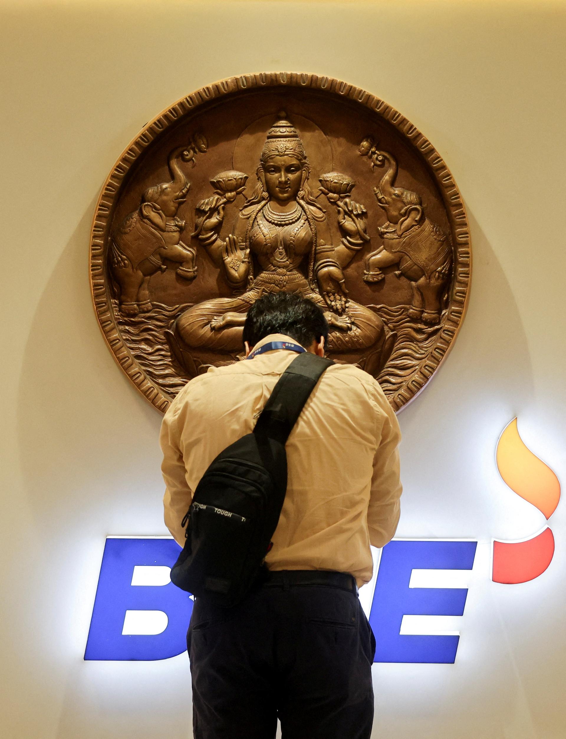 A man prays in front of a wall sculpture of Hindu goddess Lakshmi at the Bombay Stock Exchange in Mumbai, India, February 1, 2026. REUTERS/Francis Mascarenhas/File Photo